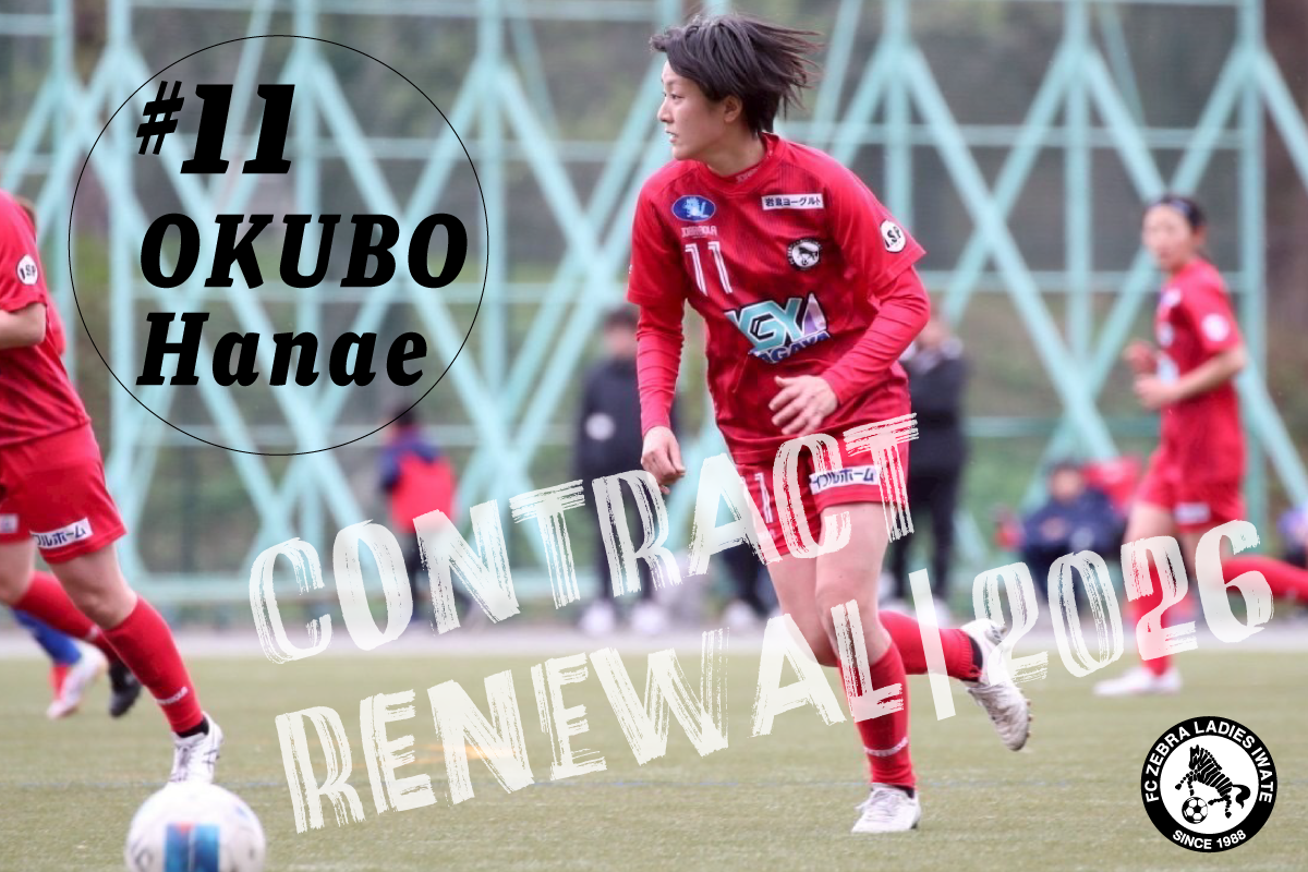 13 Jan 2026大久保 華江 選手 2026シーズン継続のお知らせこのたび、#11 大久保 華江 選手が、2026シーズンもFCゼブラレディース岩手でプレーすることが決定いたしましたので、お知らせいたします。引き続き、2026シーズンも温かいご声援を賜りますよう、よろしくお願い申し上げます。#11大久保華江